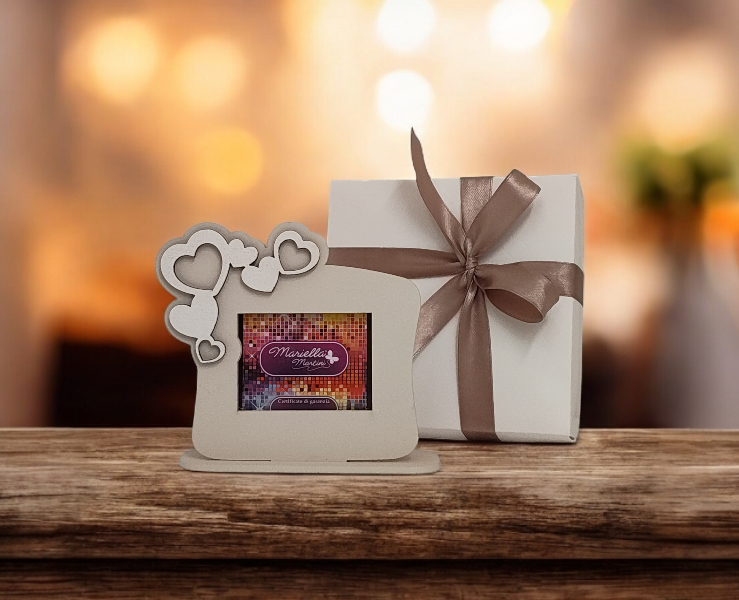 Il Portafoto con Decoro Cuori è un oggetto dal design dolce e intramontabile, pensato per chi desidera una bomboniera che unisca l'eleganza del legno alla simbologia dell'amore. Grazie alle sue dimensioni di 12x12 cm, è perfetto per accogliere i tuoi scatti più preziosi e decorare con discrezione ogni ambiente della casa.