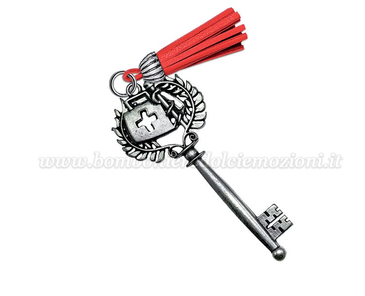 Celebra il tuo traguardo accademico con questa elegante bomboniera per laurea, raffigurante una chiave decorata con borsa dottore che rappresenta il simbolo della cura, della professionalità e dell’impegno nelle scienze mediche e sanitarie, perfetto per celebrare il successo accademico in questi ambiti. Realizzata in metallo di alta qualità, ricoperto in argento e rifinita a mano, questa miniatura è un autentico capolavoro artigianale Made in Italy. La nappina rossa, simbolo tradizionale di laurea, aggiunge un tocco di colore e significato. Misura circa 8,5 cm di altezza, ideale come dono raffinato e prezioso.