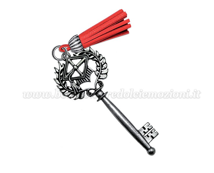 Celebra il tuo traguardo accademico con questa elegante bomboniera per laurea, raffigurante una chiave decorata con tocco simbolo della laurea. Realizzata in metallo di alta qualità, ricoperto in argento e rifinita a mano, questa miniatura è un autentico capolavoro artigianale Made in Italy. La nappina rossa, simbolo tradizionale di laurea, aggiunge un tocco di colore e significato. Misura circa 8,5 cm di altezza, ideale come dono raffinato e prezioso.