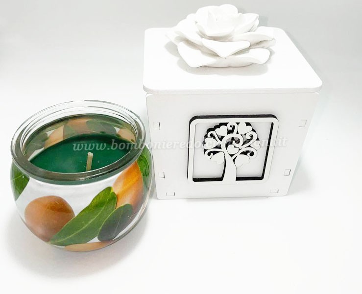 Bomboniera Matrimonio Mariella Martini Barattolo con applicazione albero della vita e rosa e candela profumata