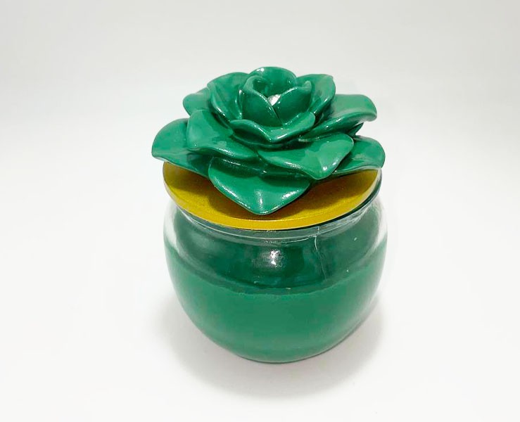 Bomboniera Matrimonio Mariella Martini candela profumata verde con coperchio con applicazione rosa su Bomboniere Dolci Emozioni