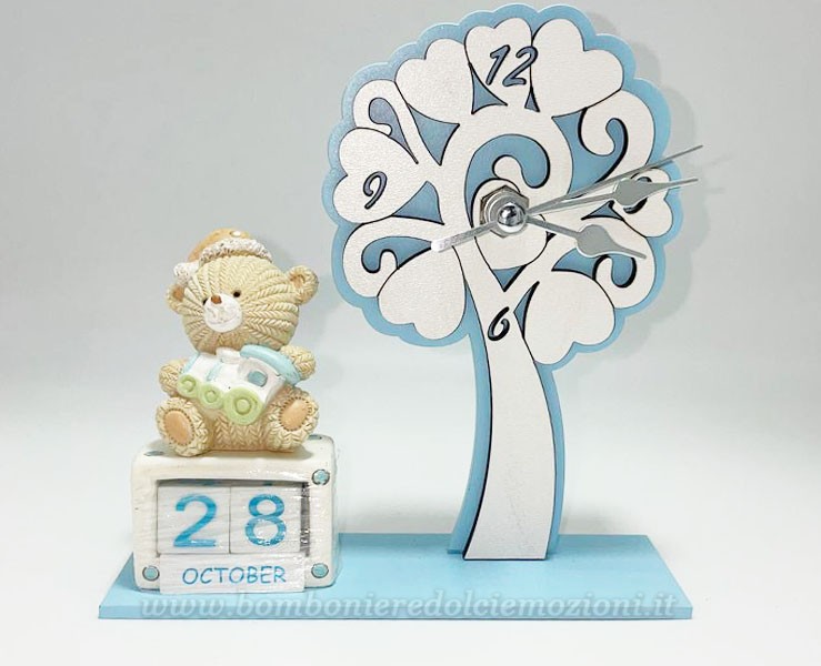 Bomboniera nascita e battesimo mariella martini Albero della vita sveglia con orsetto e calendario azzurro e bianco