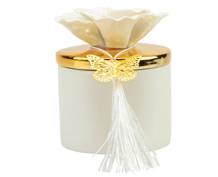 Bomboniera Matrimonio Harmony scatola porcellana bianca piccola con coperchio oro e fiore bianco con candela profumata