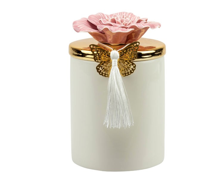Bomboniera Matrimonio Harmony scatola porcellana bianca grande con coperchio oro e fiore fucsia con candela profumata