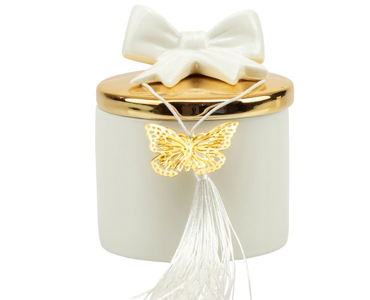 Bomboniera Matrimonio Harmony scatola porcellana bianca piccola con coperchio oro e fiocco bianco con candela profumata