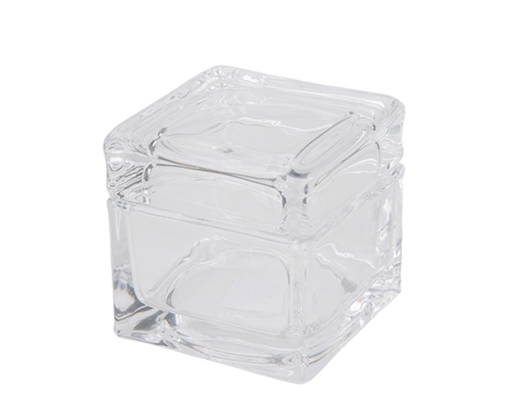 Coperchio ad Incastro: Il coperchio superiore, anch'esso in vetro trasparente, si chiude armoniosamente sulla base, proteggendo il contenuto senza nasconderlo.