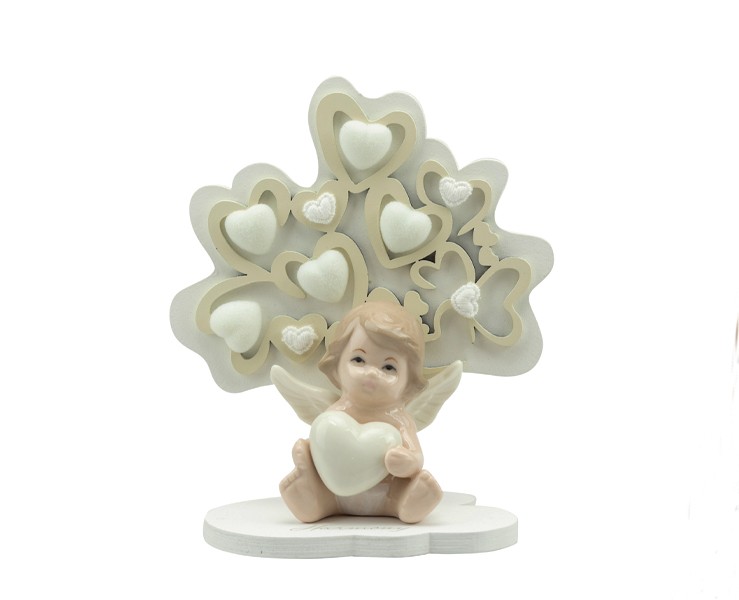 Bomboniera Prima comunione Harmony albero della vita cuori tortora medio con angelo porcellana