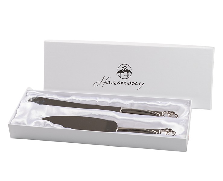 Bomboniera Matrimonio harmony SET PALA E COLTELLO TORTA SILVER DEC. DOPPIO CUORE CON STRASS CON GIFT BOX INCLUSO