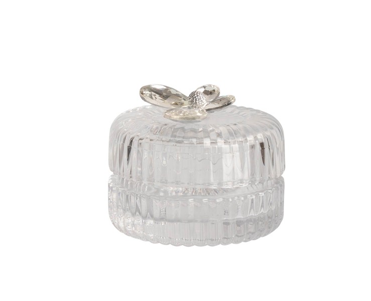 Una delicata scatolina in vetro trasparente dal design a righe, impreziosita da un'elegante applicazione a forma di farfalla in cristallo. Perfetta per custodire piccoli oggetti o confetti, è ideale come bomboniera per matrimoni, anniversari e altre occasioni speciali.