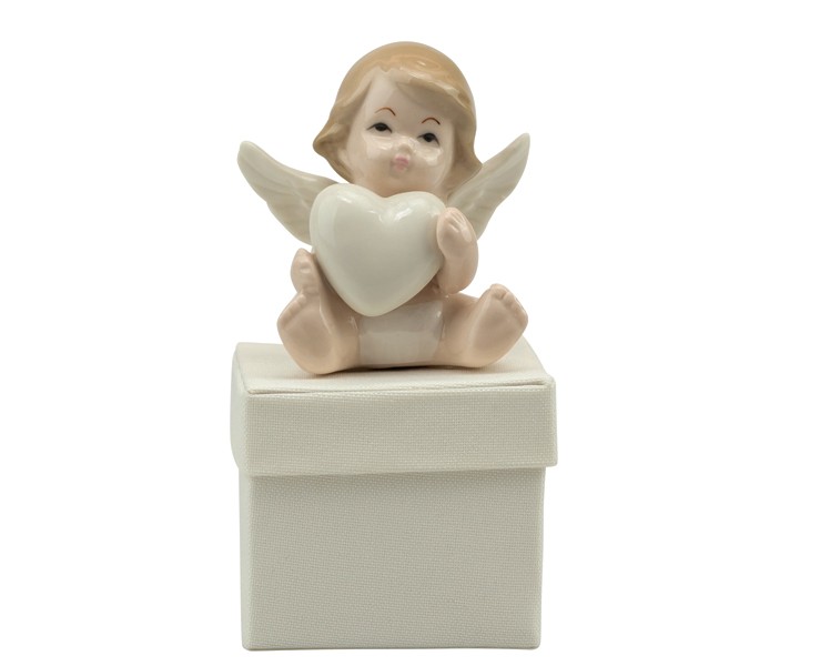 SCATOLINA QUADRATA IN TESSUTO BIANCA CON ANGELO CON CUORE IN PORCELLANA