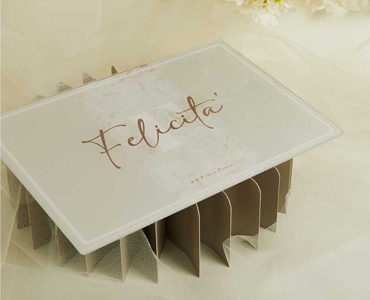 Il design è splendidamente elegante: presenta uno sfondo con effetto marmorizzato sui toni neutri del bianco e beige. Il tutto è impreziosito dalla parola "Felicita" in un raffinato carattere calligrafico color rame/oro rosa. Questo lo rende un pezzo unico e di buon augurio.