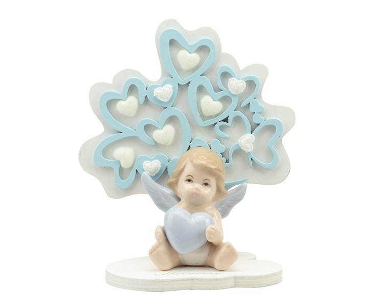 Bomboniera Nascita e Battesimo Harmony albero della vita CUORI CELESTE MEDIO CON ANGELO PORCELLANA CELESTE