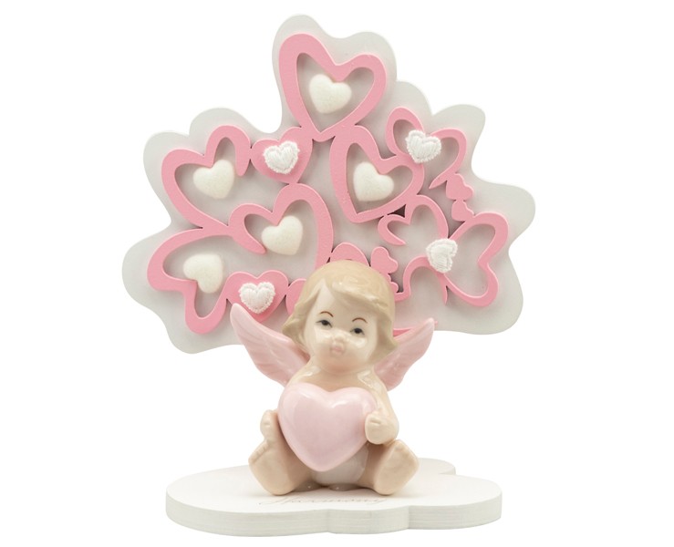 Bomboniera Nascita e Battesimo Harmony albero della vita cuori rosa medio con angelo porcellana rosa