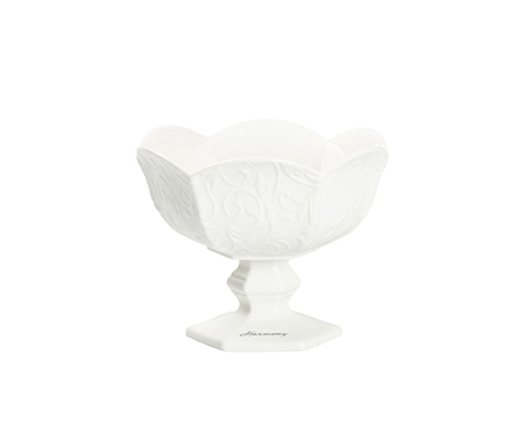 Lavorazione a Rilievo "Alice": L'intera superficie esterna della coppa è impreziosita da eleganti fregi floreali e volute a rilievo, che donano movimento e profondità alla porcellana.