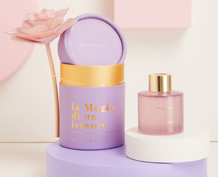 Elegante diffusore di fragranze, con un delicato fiore in carta che arricchisce il design raffinato. La bomboniera è impreziosita da una scatola coordinata color viola con dettagli dorati, perfetta per celebrare un'occasione speciale come il matrimonio.