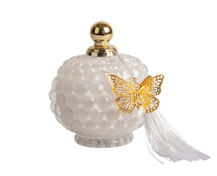 Candela in Vetro Profumata Jasmine Potiche con Tassel e Farfallina Oro - Bomboniera Harmony