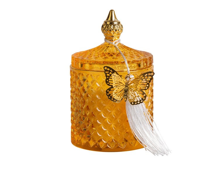 Bomboniera Matrimonio Harmony Candela in Vetro ambra Profumata vaniglia con Tassel e Farfallina Oro grande