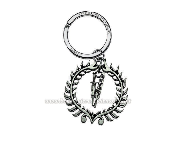 Un elegante portachiavi con ciondolo a forma di siringa e termometro all'interno di una corona d’allor. Perfetto come bomboniera per laureati in tutte le facoltà di infermieristica e medicina, è un regalo raffinato e significativo.