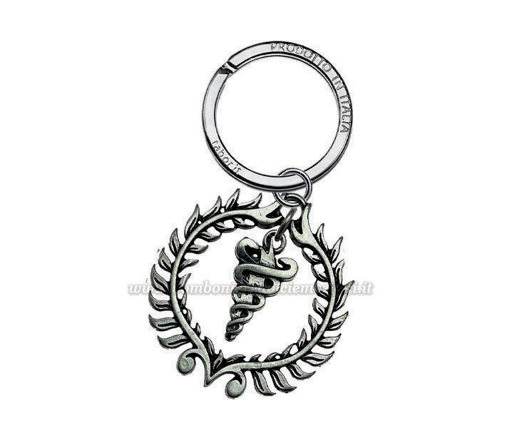 Un elegante portachiavi con ciondolo che raffigura un bastone al quale si avvolgono due serpenti all'interno di una corona d’alloro. Perfetto come bomboniera per laureati in Fisioterapia, Medicina, Farmacia e altre facoltà mediche, è un regalo raffinato e significativo.