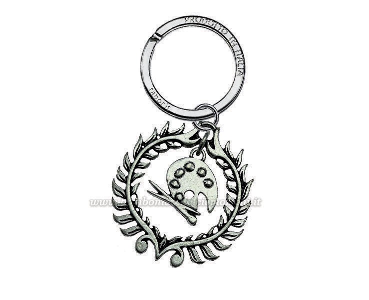 Un elegante portachiavi con ciondolo raffigurante una tavolozza da pittore all'interno di una corona d’alloro, simbolo l'espressione creativa. Perfetto come bomboniera per laureati in Accademia di Belle Arti, Facolta o Dipartimenti di Arti Visive, Desing e Grafica, è un regalo raffinato e significativo.