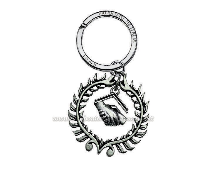 Un elegante portachiavi con ciondolo raffigurante una stretta di mano all'interno di una corona d’alloro, simbolo di fiducia, collaborazione, giustizia e impegno sociale . Perfetto come bomboniera per laureati in Giurisprudenza, Scienze Politiche, Economia e Commercio, è un regalo raffinato e significativo.