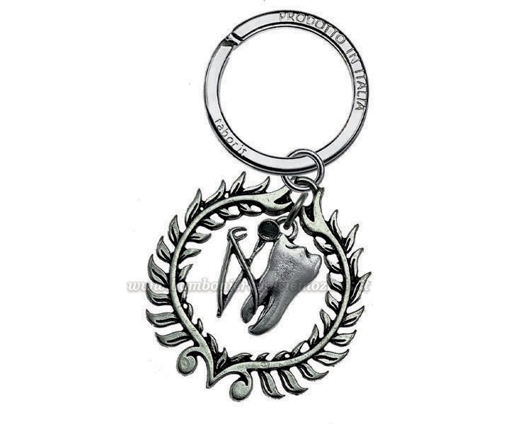Un elegante portachiavi con ciondolo che raffiguara un dente con strumenti odontoiatrici di goniometro all'interno di una corona d’alloro, simbolo di precisione, professionalità e competenza. Perfetto come bomboniera per laureati in Odontoiatria, è un regalo raffinato e significativo.