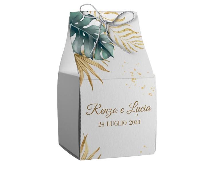 Scatolina porta confetti personalizzata quadrata decoro foglie oro verde