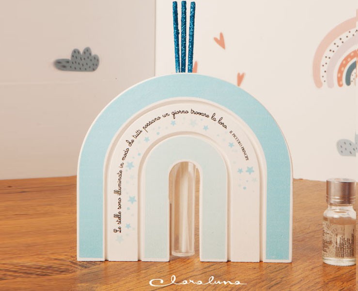 Bomboniera Claraluna Nascita Battesimo compleanno profumatore con kit essenza arco arcobaleno frase azzurro