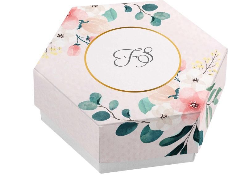 Scatolina porta confetti personalizzata esagonale decoro floreale rosa bianco