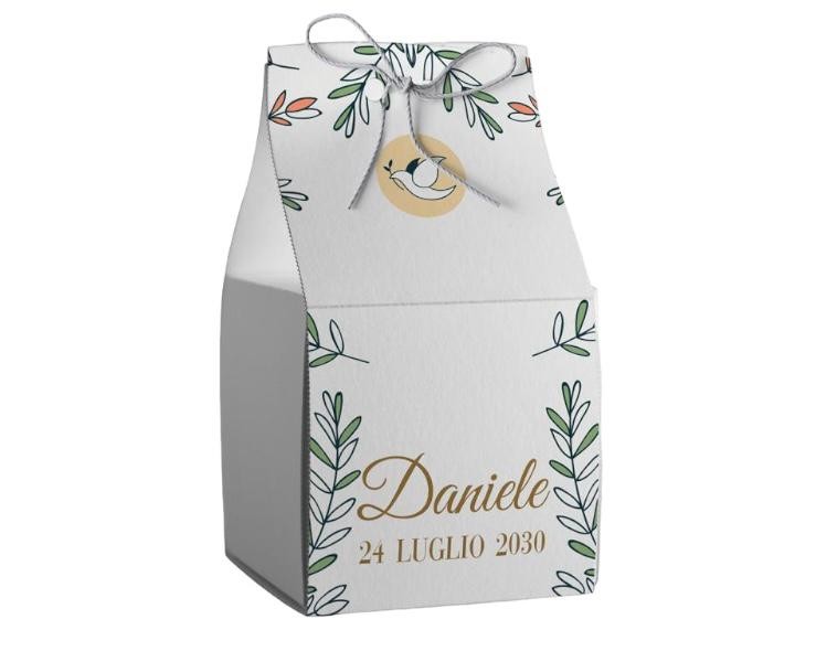 Scatolina porta confetti personalizzata quadrata decoro colomba e rami ulivo