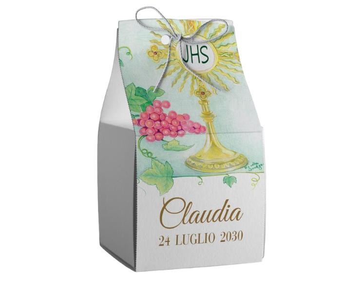 Scatolina porta confetti personalizzata quadrata decoro calice JHS uva