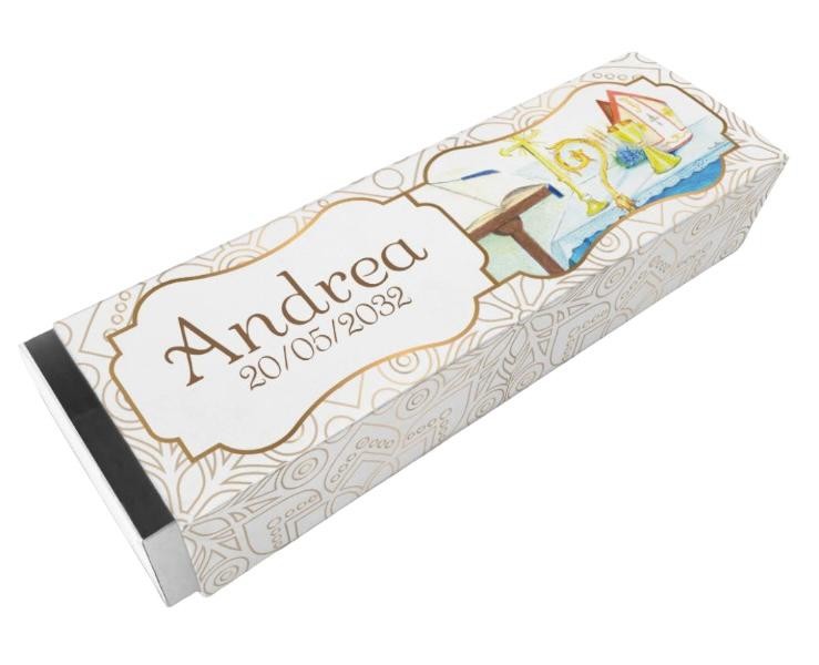 Scatolina porta confetti personalizzata rettangolare decoro bibbia pastorale calice