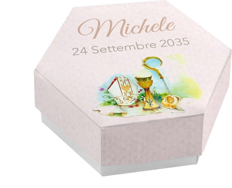 Scatolina porta confetti personalizzata esagonale decoro calice e pastorale