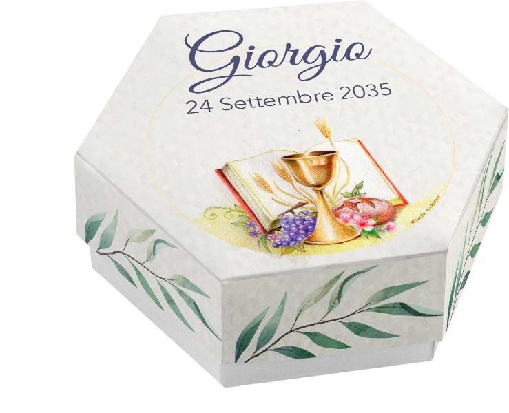 Scatolina porta confetti personalizzata esagonale decoro calice bibbia e rami ulivo