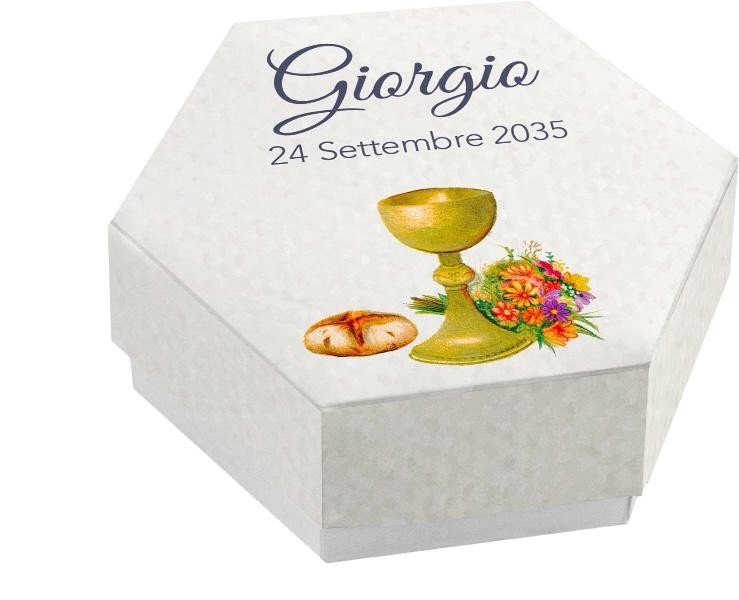 Scatolina porta confetti personalizzata esagonale decoro calice pane e fiori