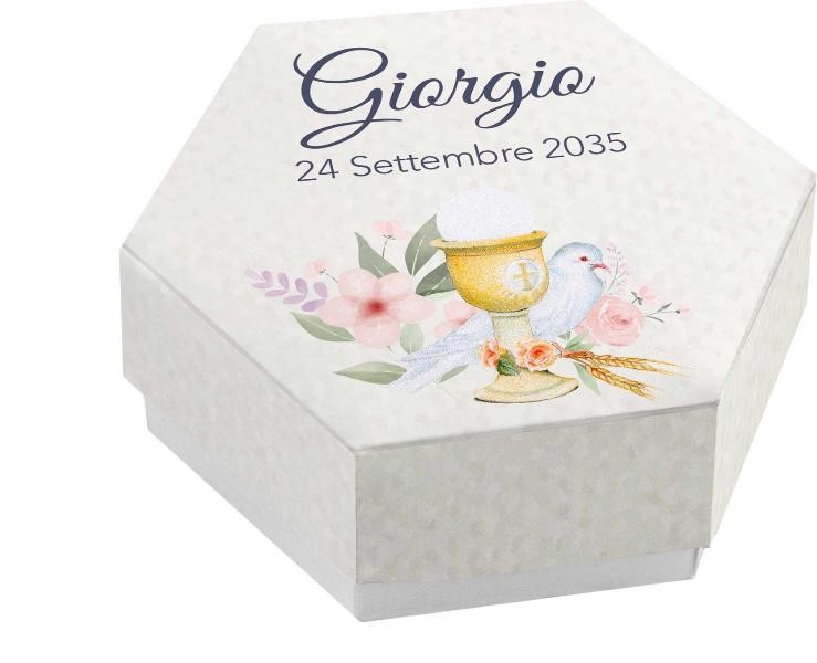 Scatolina porta confetti personalizzata esagonale decoro calice colomba e fiori