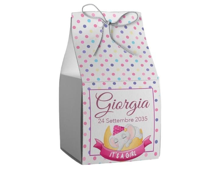 Scatolina porta confetti personalizzata quadrata a pois rosa con elefantino