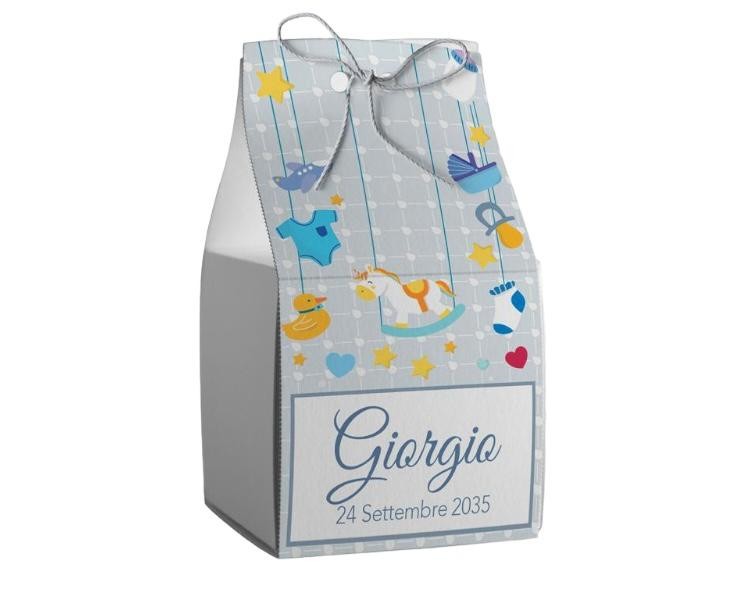 Scatolina porta confetti personalizzata quadrata blu decoro giochi vari