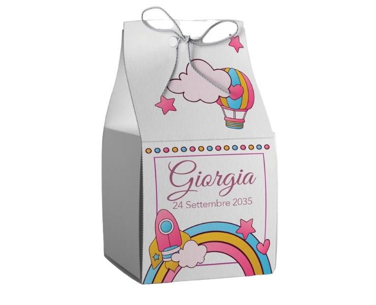 Scatolina porta confetti personalizzata quadrata decoro arcobaleno mongolfiera e razzo toni rosa