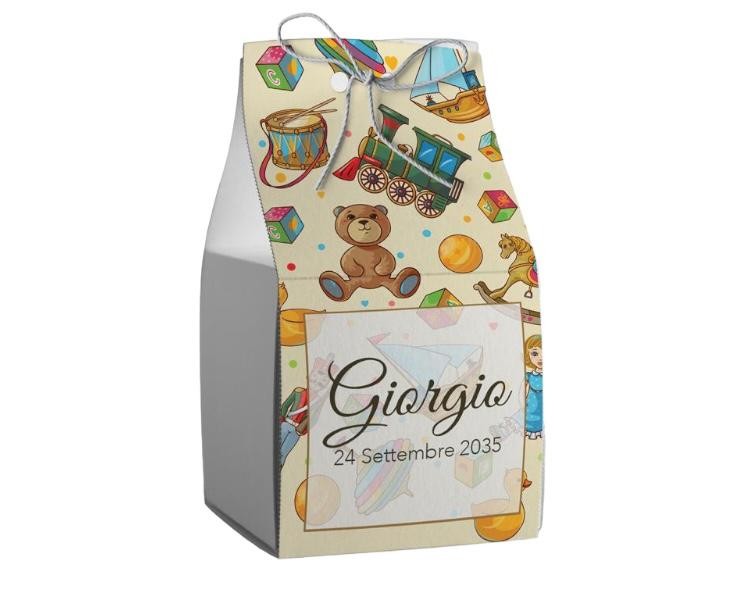 Scatolina porta confetti personalizzata quadrata panna decoro giochi vari