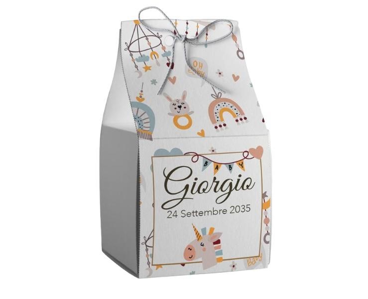 Scatolina porta confetti personalizzata quadrata decoro giochi vari e unicorno