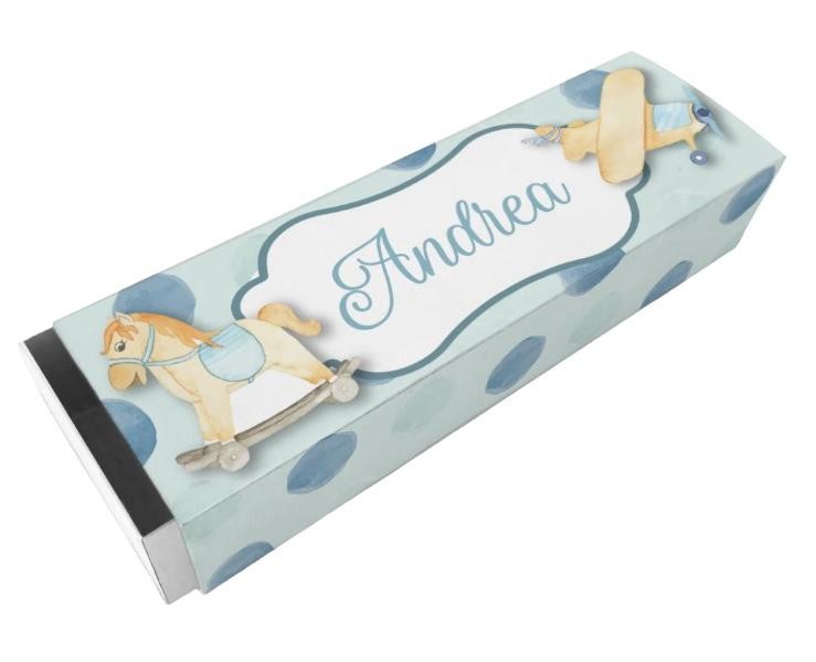 Scatolina porta confetti personalizzata rettangolare fantasia pois blu con pony e aeroplano