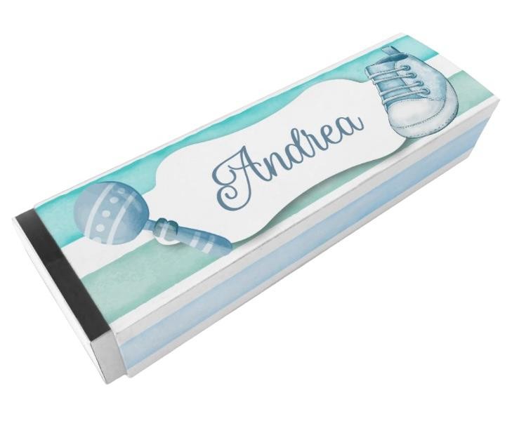 Scatolina porta confetti personalizzata rettangolare blu con scarpetta e maracas