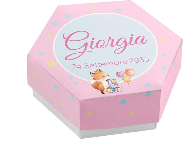 Scatolina porta confetti personalizzata esagonale rosa con volpe