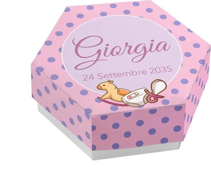 Scatolina porta confetti personalizzata esagonale rosa con pois blu con cavalluccio a dondolo