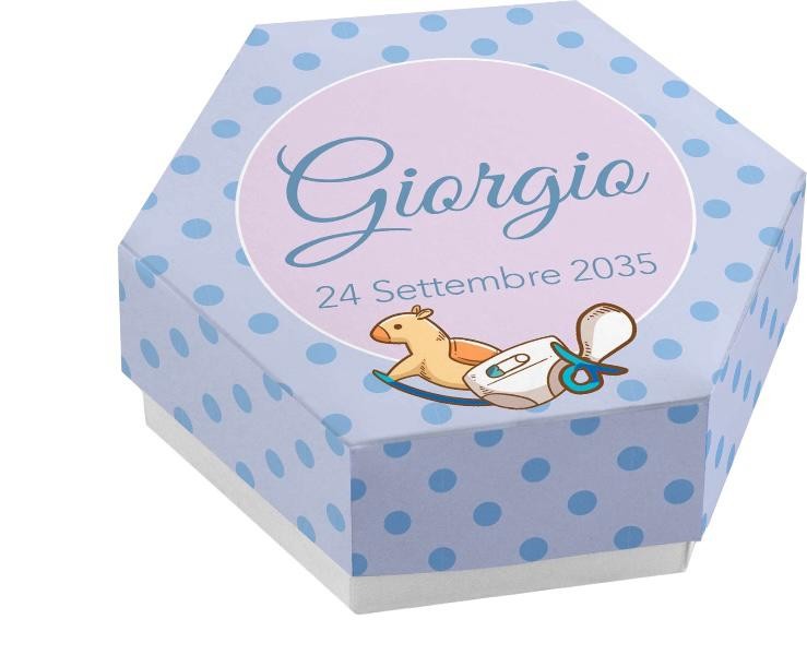 Scatolina porta confetti personalizzata esagonale blu con pois e cavalluccio a dondolo