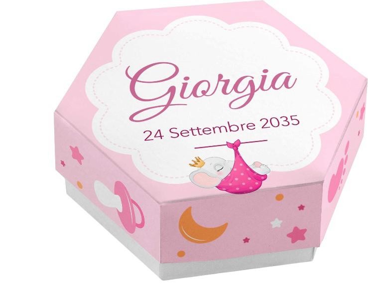 Scatolina porta confetti personalizzata esagonale rosa con elefantino cullato