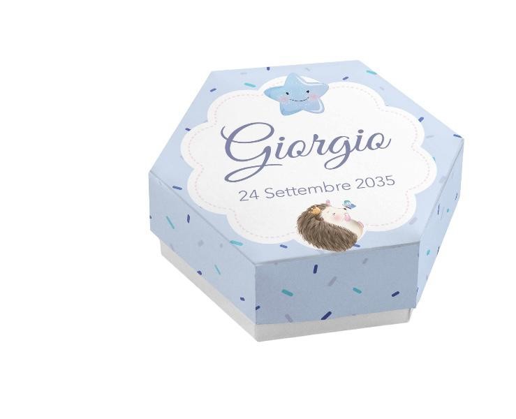 Scatolina porta confetti personalizzata esagonale blu con riccio e stella