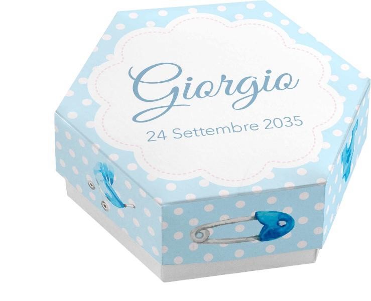 Scatolina porta confetti personalizzata esagonale blu pois con spilla e passeggino
