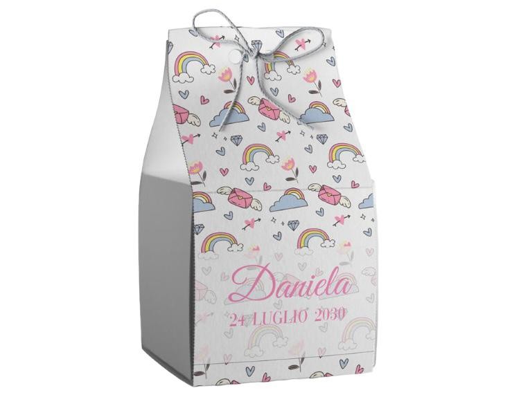 Scatolina porta confetti personalizzata quadrata bianca con arcobaleni lettere cuoricini